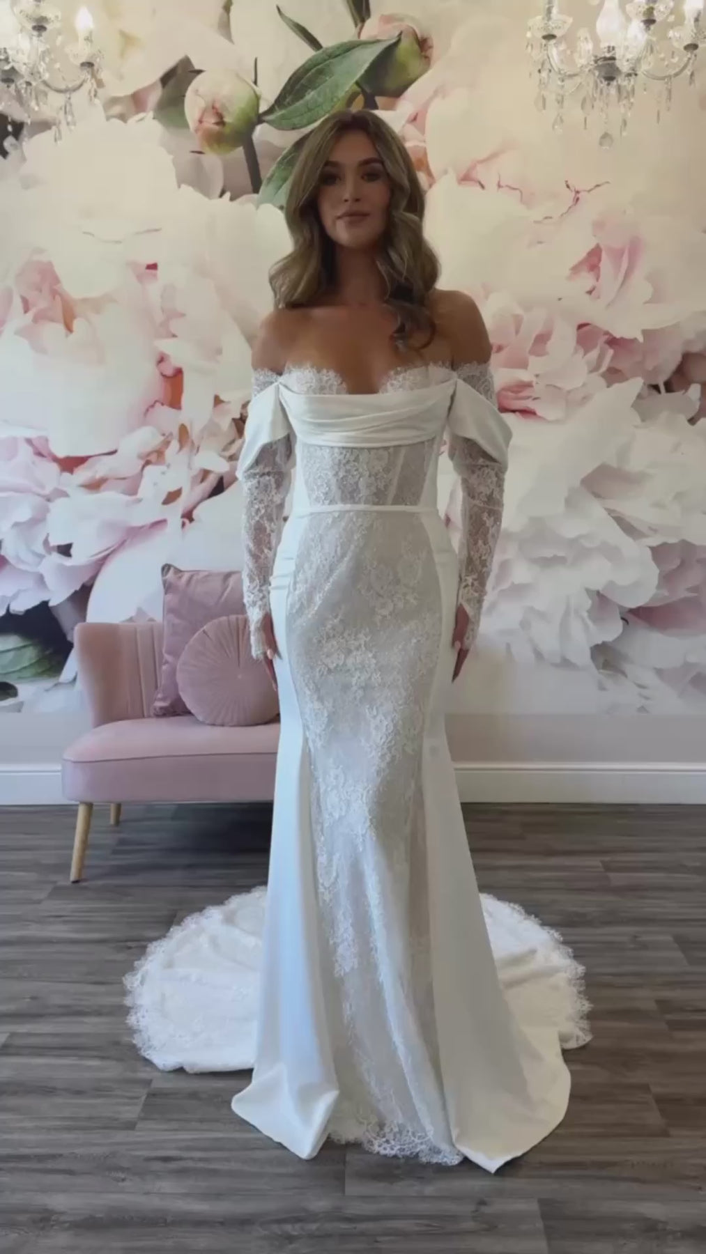 This classy mermaid gown is the perfect balance of sophistication and romance. The sweetheart neckline is beautifully outlined with a draped satin adornment, while the softly draped cold-shoulder detail complements the delicate guipure lace sleeves for an effortlessly graceful look. Satin side panels frame the fitted guipure bodice and skirt, adding both structure and modesty to the design. The mermaid silhouette hugs the figure in all the right places, flowing into a timeless finish that feels both elegant and refined. A gown designed for the bride who loves classic beauty with modern detailing.