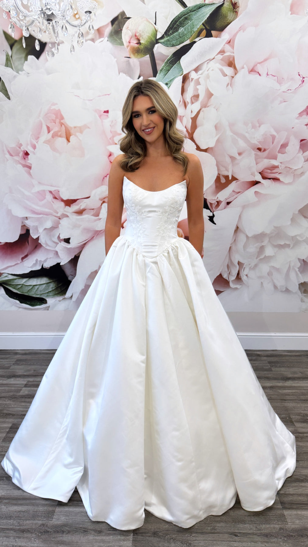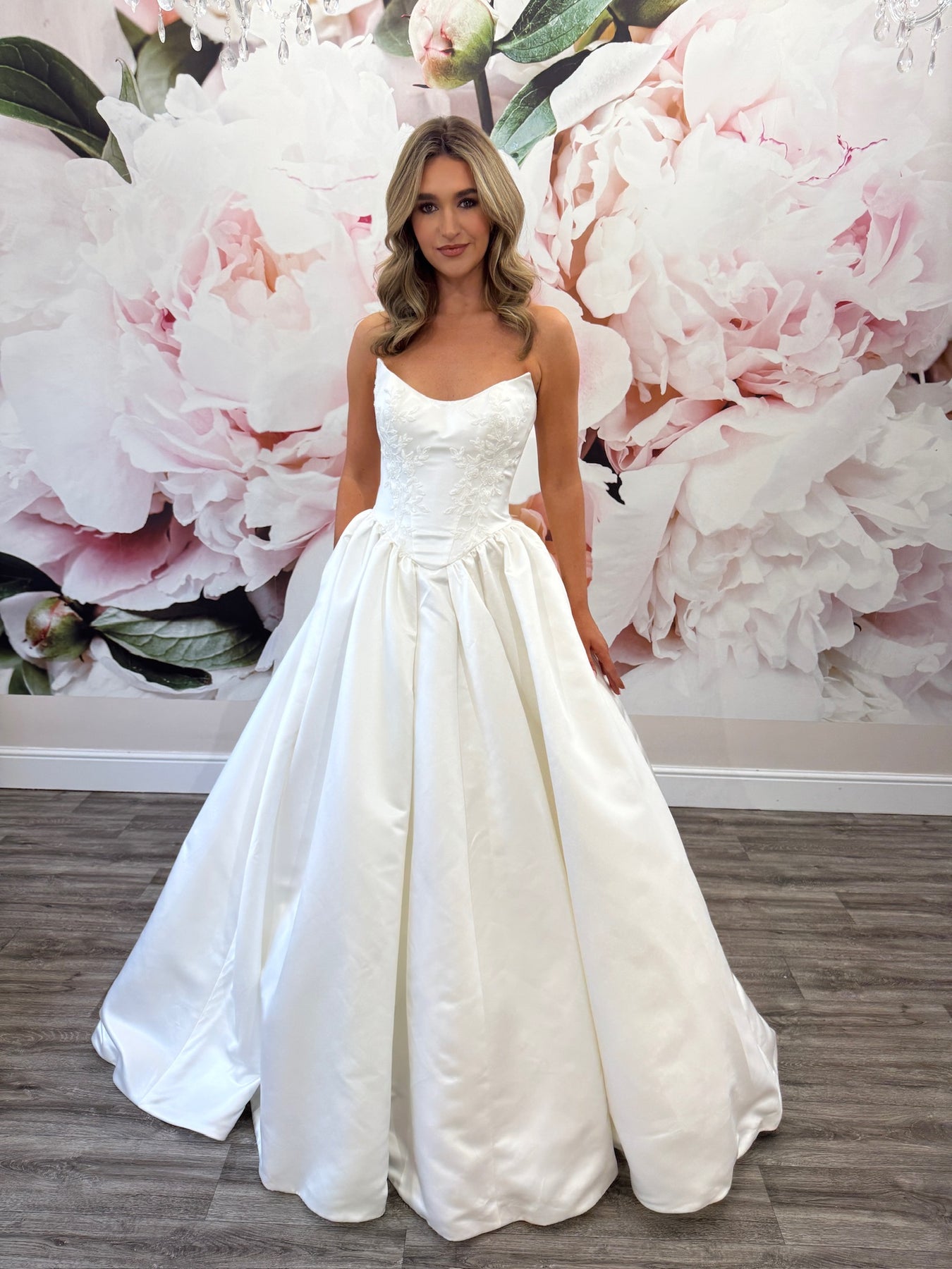 Bethany offers a fresh take on classic bridal elegance with its stunning ballgown silhouette crafted from Grand Satin fabric. The strapless bodice is adorned with delicate lace appliqués, adding texture and romantic detail while maintaining a sleek and modern feel. Featuring a chic scooped cat-eye neckline and expertly place seaming, the bodice accentuates the natural hourglass shape. From the defined basque waist, sculpted pleats unfold into a full, voluminous skirt that exudes regal sophistication. A line of fabric-covered buttons trails from the bodice down the dramatic train, completing this clean, structured gown designed to make a lasting impression