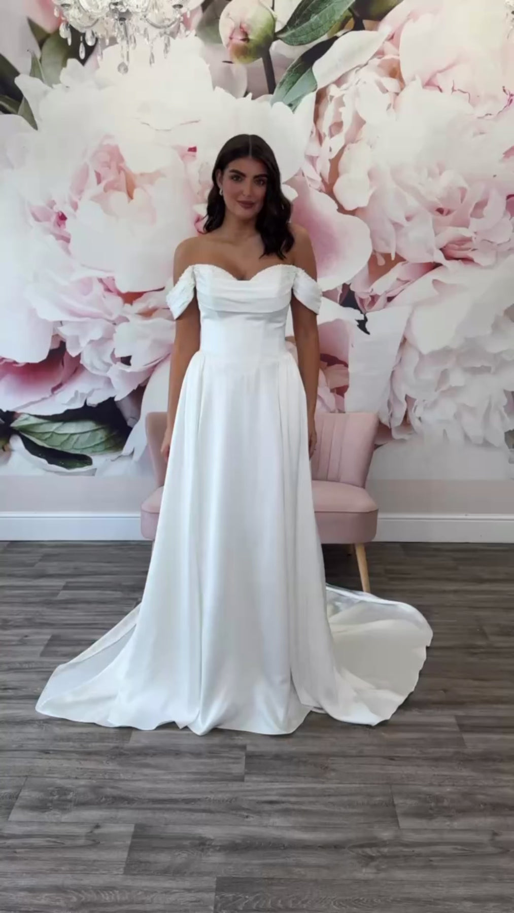 Blake is satin sophistication at its finest — a modern fairytale for the contemporary princess bride. ✨ Her luminous A-line silhouette glides effortlessly from bodice to hem, with a pearl-detailed sweetheart neckline adding the dreamiest touch of shimmer. A softly draped satin band and defined basque waist create a beautifully flattering shape, flowing into a full, romantic skirt with graceful volume. Finished with delicate pearl buttons down the back, she’s the perfect blend of timeless elegance and modern romance. 🤍