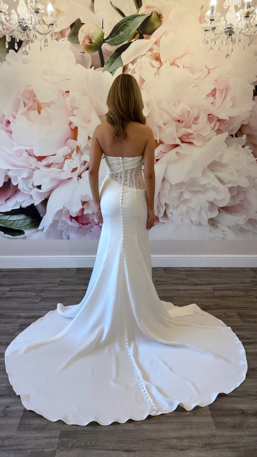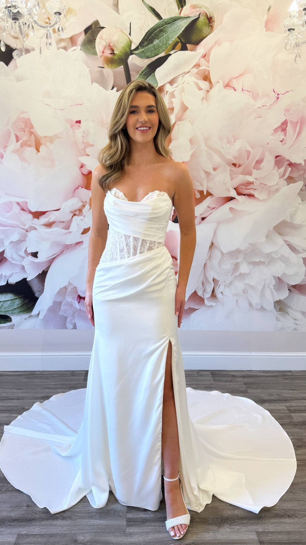 Chic, sophisticated, and a little daring — Bria is modern bridal elegance with a romantic twist. Crafted in luxurious Belle Satin, her strapless draped bodice reveals a softly structured peekaboo corset adorned with delicate lace appliqués for the dreamiest touch of detail. The sculpted corset cinches the waist beautifully, flowing into a sleek satin column skirt that moves with effortless grace. Finished with a row of covered buttons down the back, Bria is the perfect balance of timeless sophistication and contemporary edge. ✨
