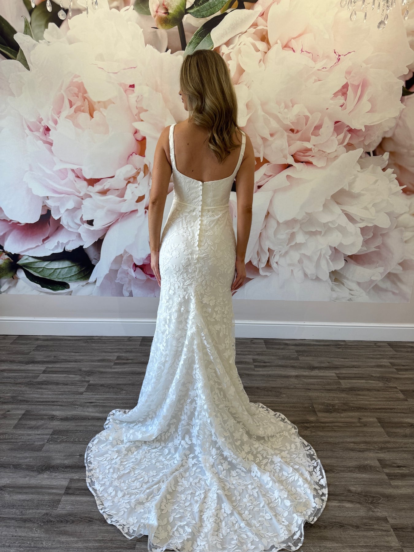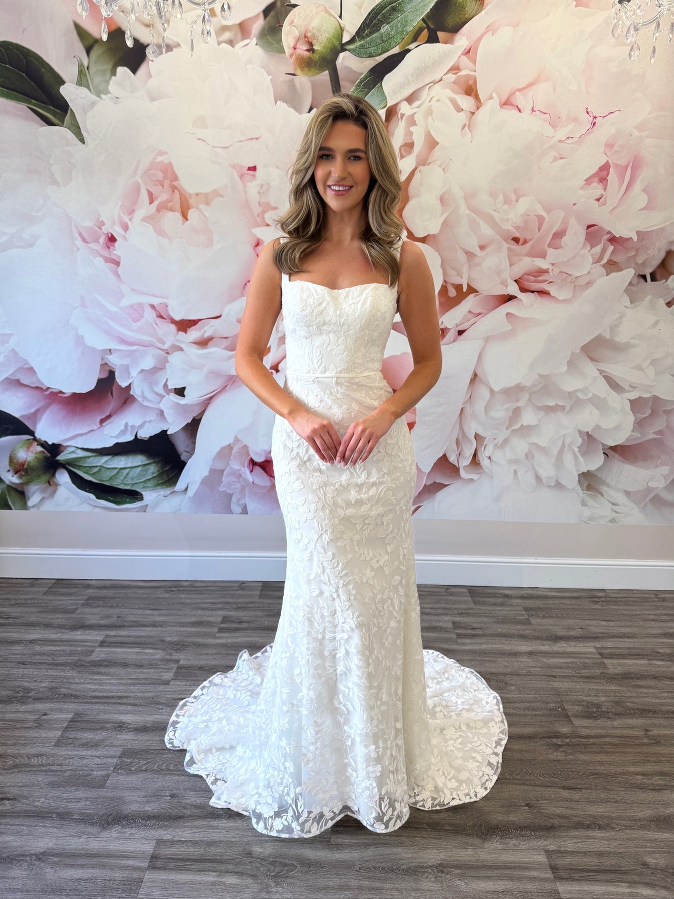 Brooke is the perfect harmony of classic elegance and modern charm. A soft scoop neckline and simple straps create a beautifully clean silhouette, while the sheer tulle overlay is delicately adorned with leafy lace appliqués for a natural, romantic feel. Subtle illusion side cutouts add a touch of contemporary allure, flowing into a sleek skirt and graceful train that move with timeless sophistication.