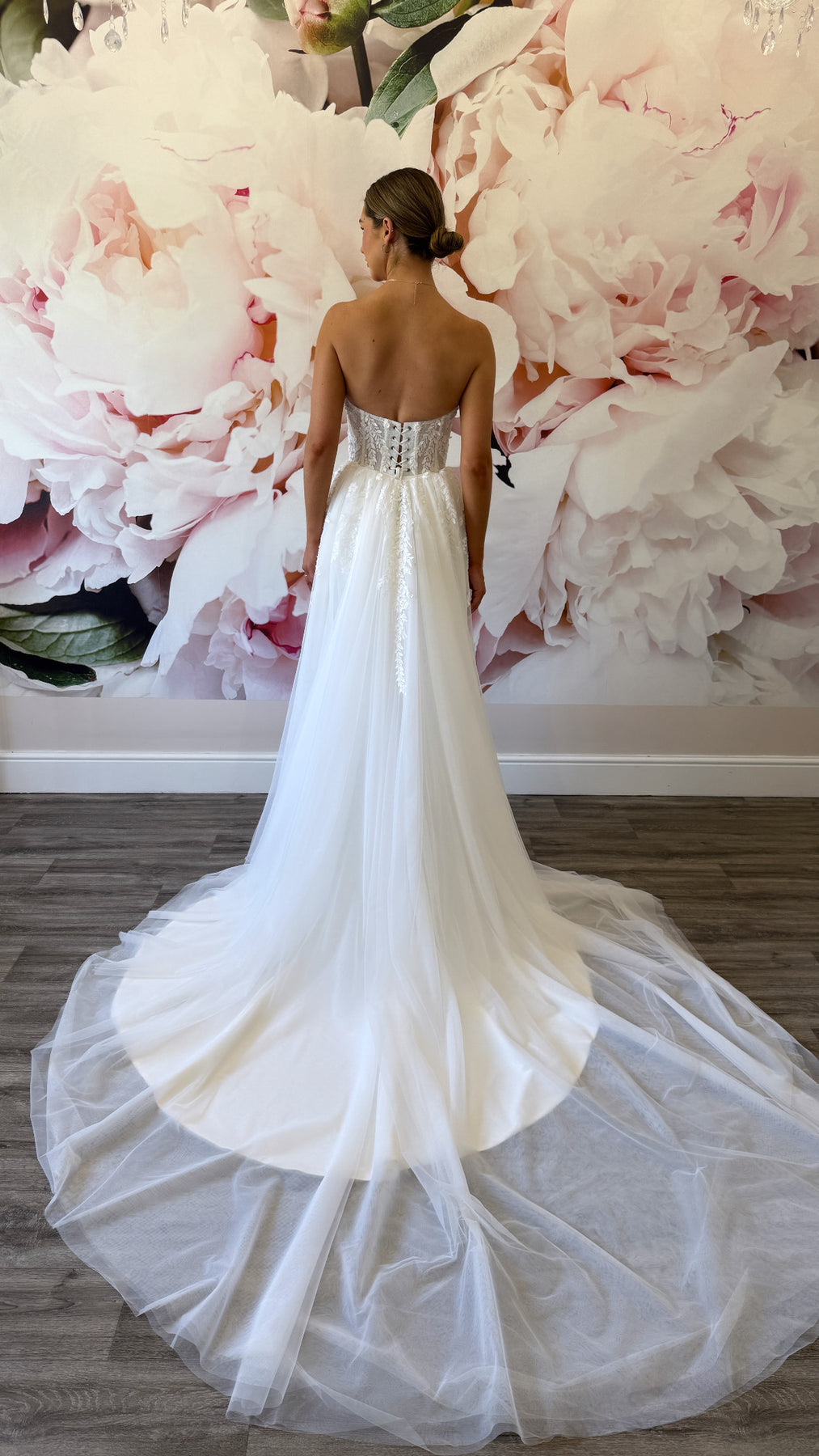Montblanc is a true showstopper—dreamy, dramatic, and unforgettable. This gown pairs a romantic sweetheart neckline with a corset-style lace-up back, ensuring the perfect fit and a beautifully feminine silhouette. The bodice features sheer detailing at the waist and is intricately adorned with hand-embroidered leaves and flowers that trail seamlessly into the soft, voluminous tulle skirt. An asymmetric gather at the hip and a daring thigh-high split (with our sample shown six inches lower) add a bold, modern edge, while the sheer embroidered underskirt and delicate floral waistband bring a touch of ethereal magic. For added versatility, Montblanc can be ordered as the gown alone or with its matching overskirt, giving brides the option to transform their look from ceremony to celebration.