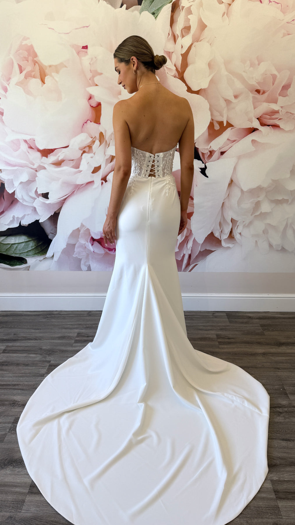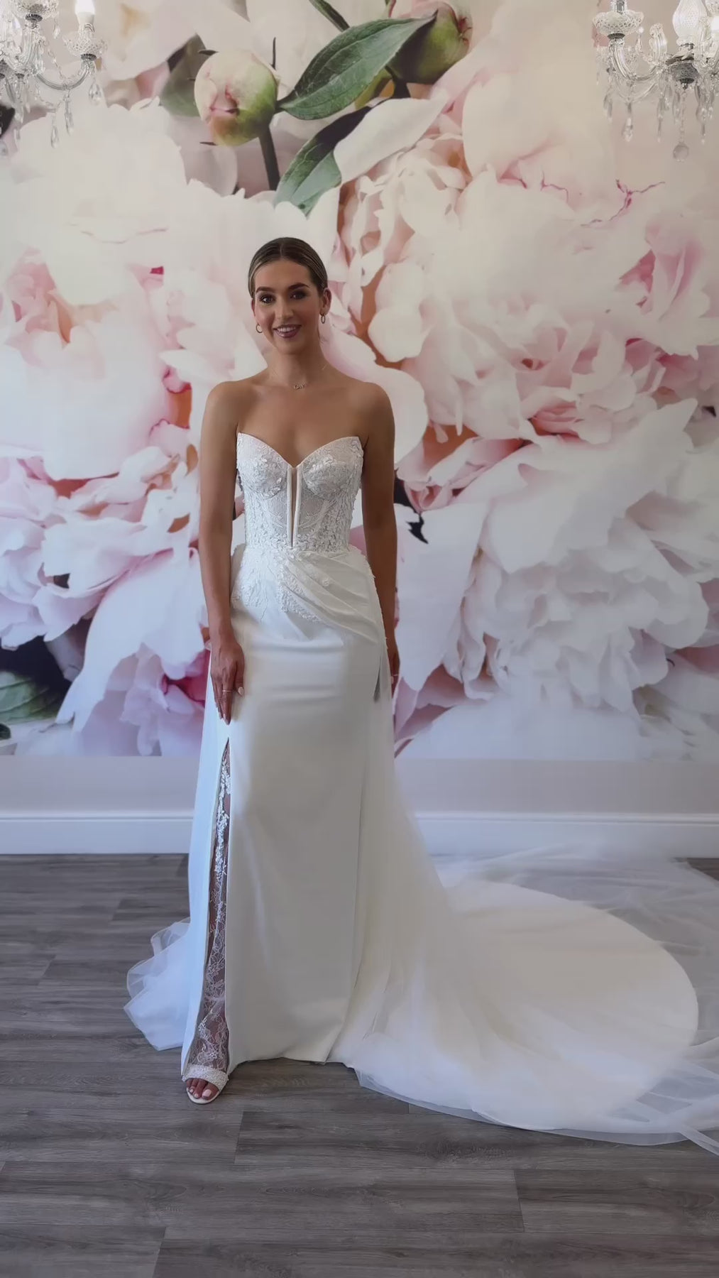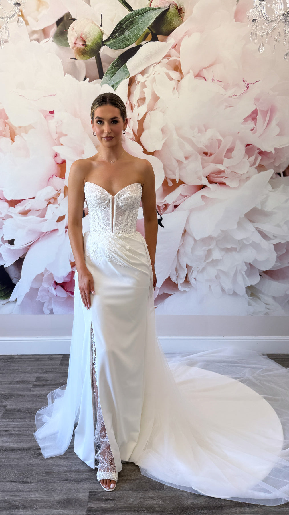 Our sample dresses in store range from size 10 to size 22 approx. The samples rarely fit anyone perfectly and our consultants are experts at clipping and pinning to help you you a great vision of the final fit.