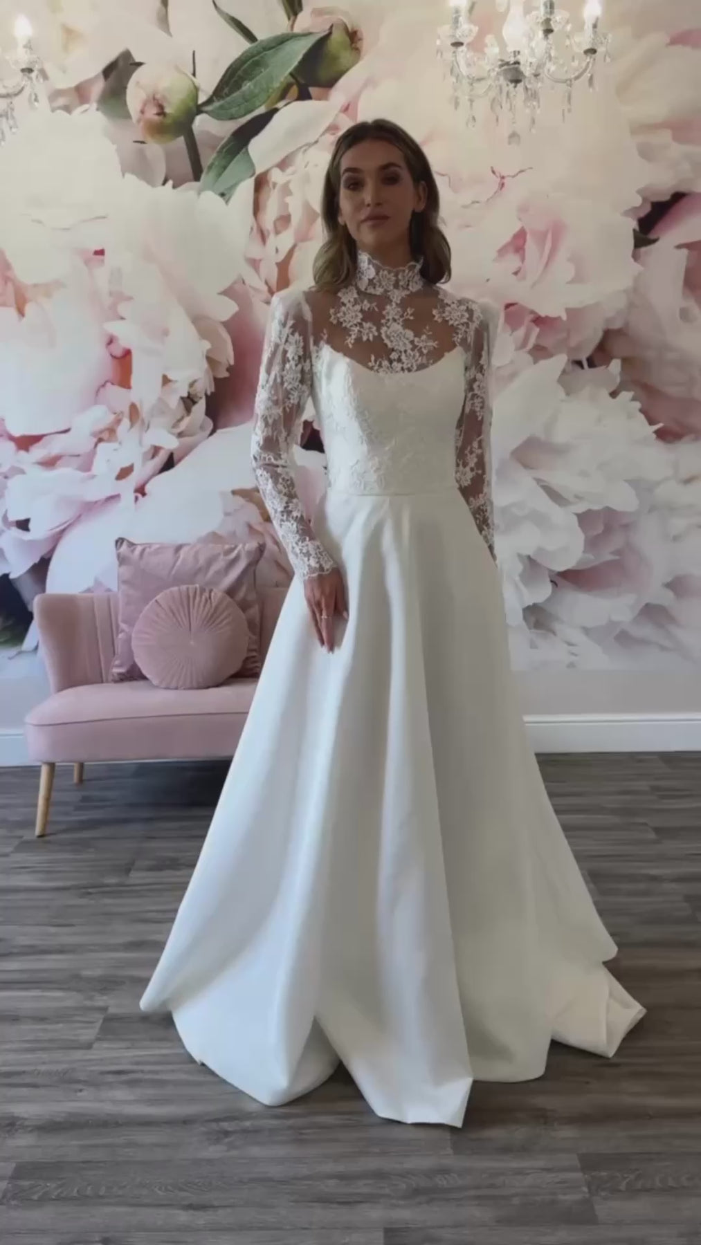 This eye-catching gown is all about striking contrasts and timeless elegance. The guipure lace turtleneck neckline and long sleeves create a beautifully refined, high-fashion look, while the structured bodice with its soft round neckline adds shape and sophistication. Flowing from the waist, the voluminous satin skirt brings dramatic movement and luxurious texture, perfectly balancing the intricate lace above. The result is a gown that feels regal, romantic, and unforgettable—ideal for the bride who wants to make a graceful yet powerful statement down the aisle.