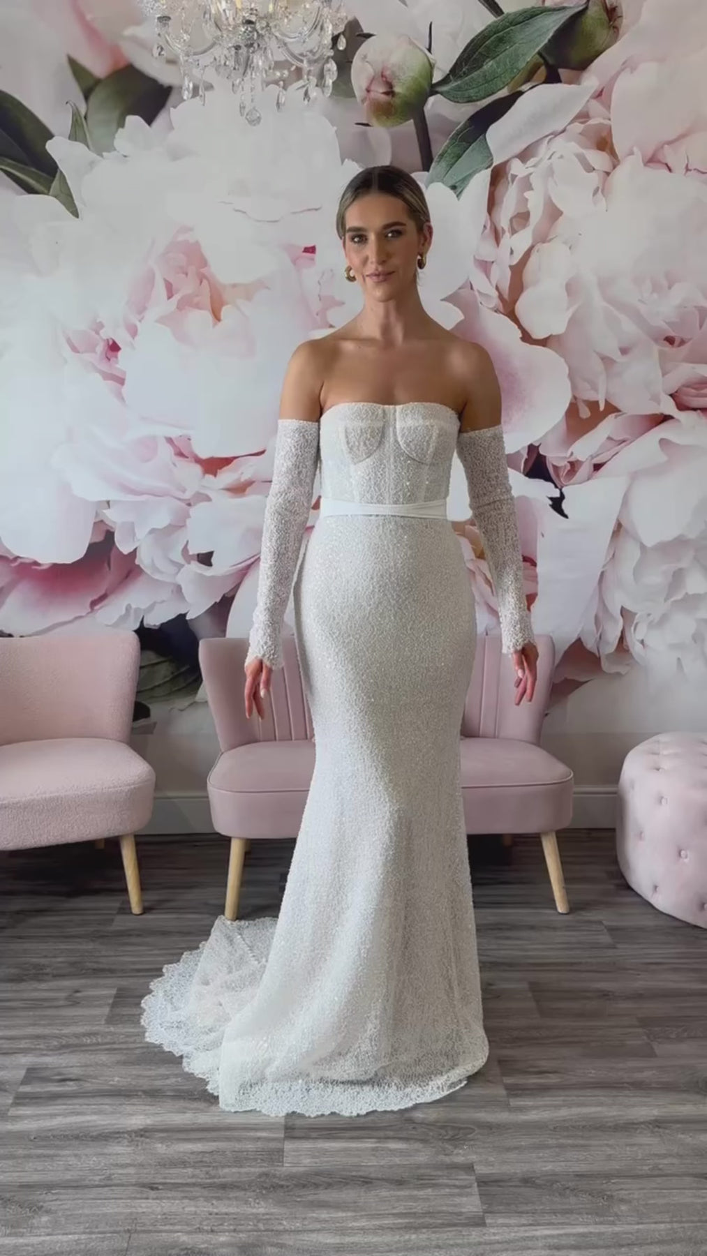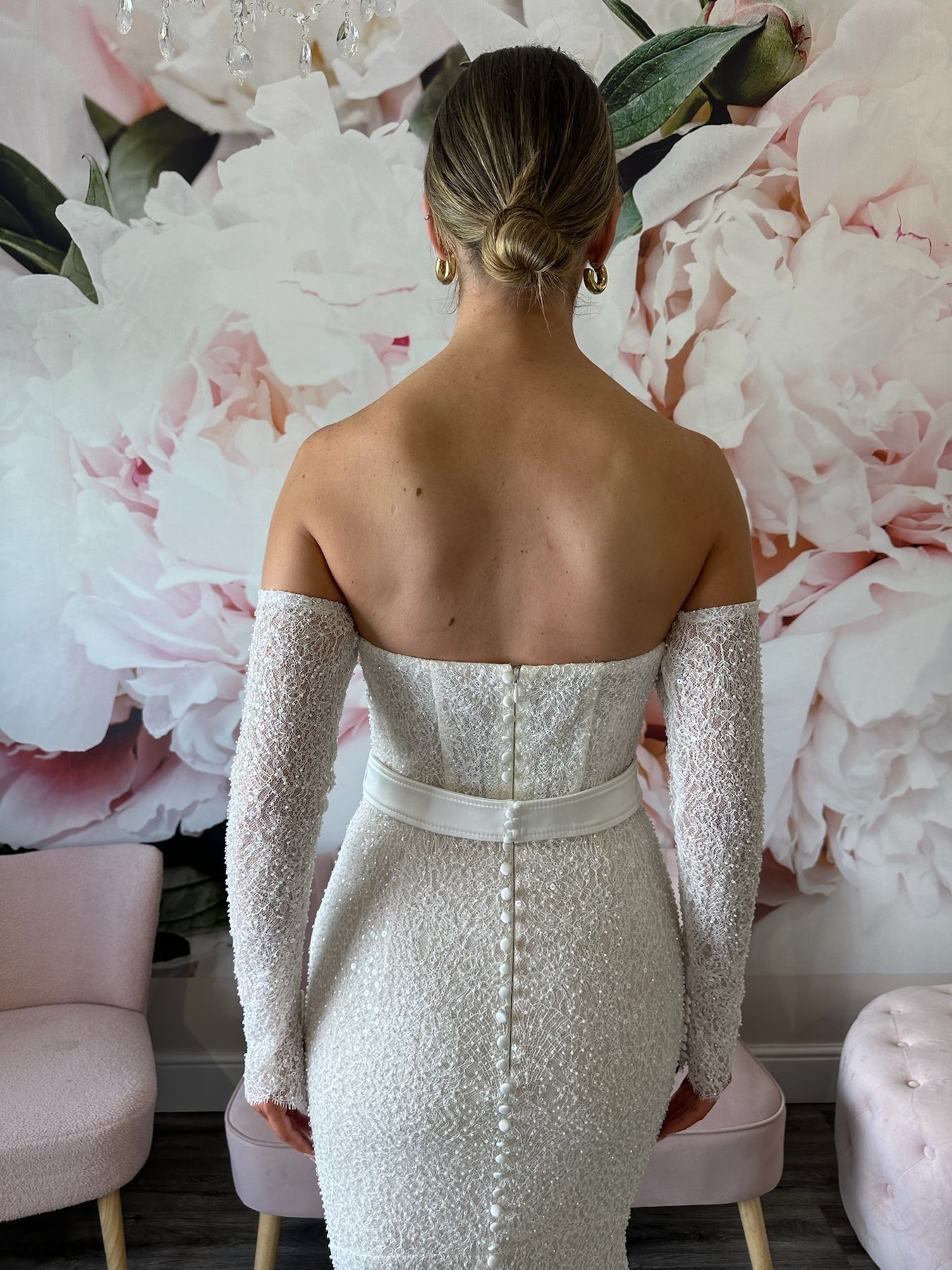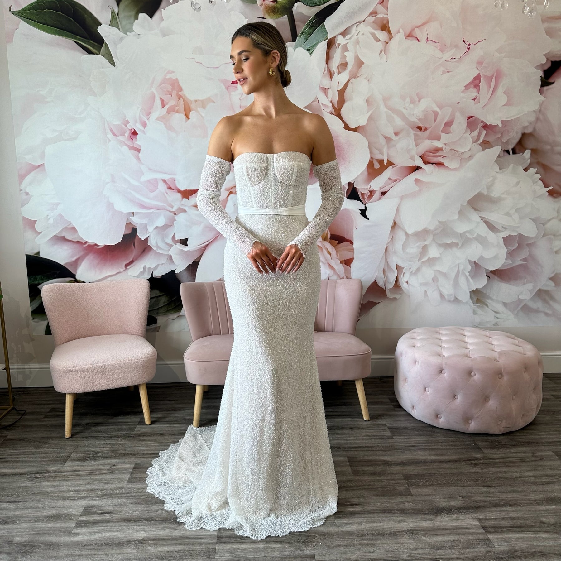 Eddie by Wona Concept is an enchanting mermaid gown, a true masterpiece of romance and glamour. Crafted from luxurious shimmer fabric, she glistens with every movement, radiating an ethereal glow that captivates from the very first glance. Exquisite pearl and bead embellishments cascade down the bodice, adding texture, opulence, and a touch of couture brilliance. Her romantic sweetheart neckline frames the décolletage and accentuates natural curves, blending sensuality with timeless elegance. For versatile styling, Eddie features detachable sleeves, offering brides the choice of a sleek strapless look or the graceful charm of delicate sleeves. A gown designed to dazzle, she ensures an unforgettable bridal moment filled with beauty, sophistication, and magic.