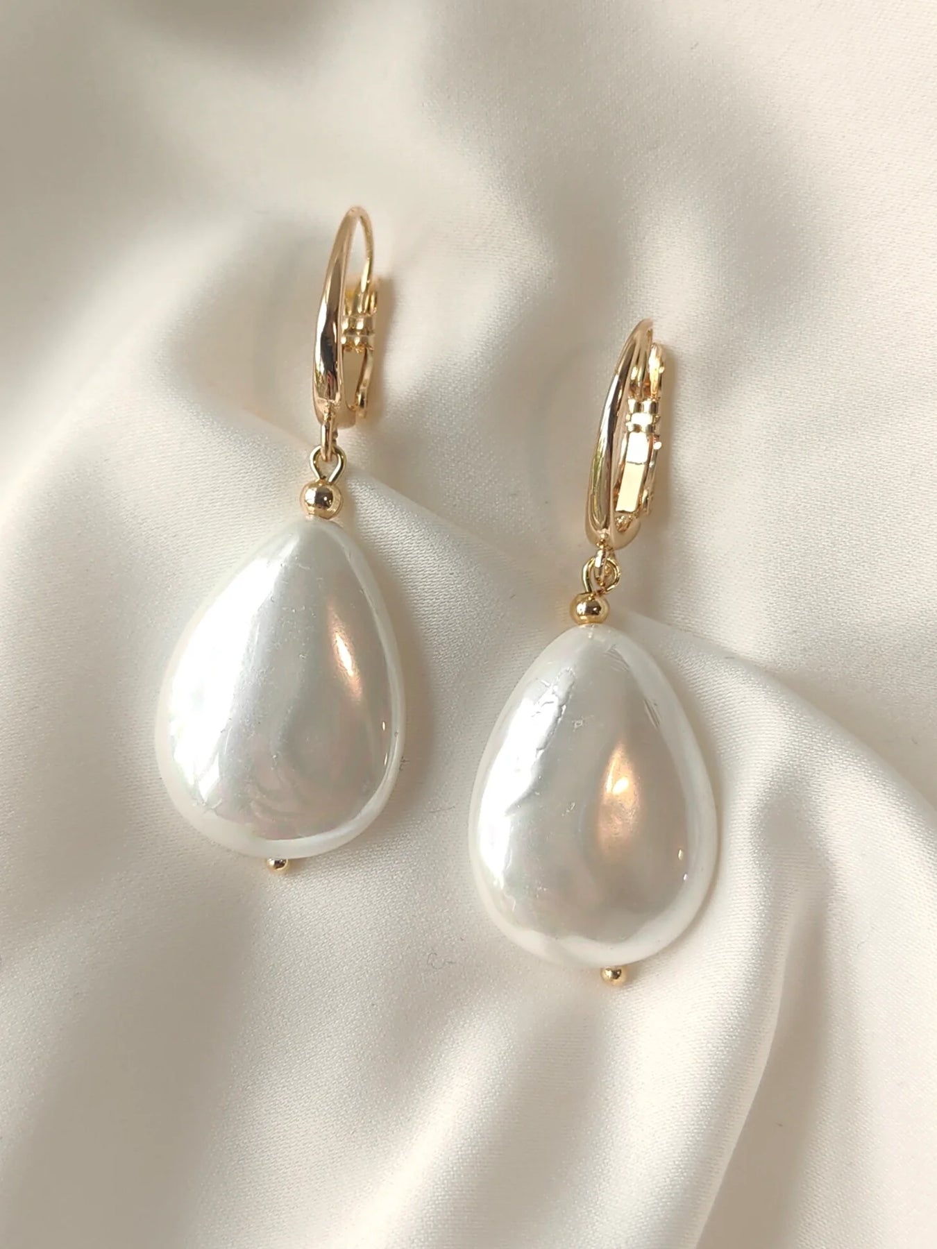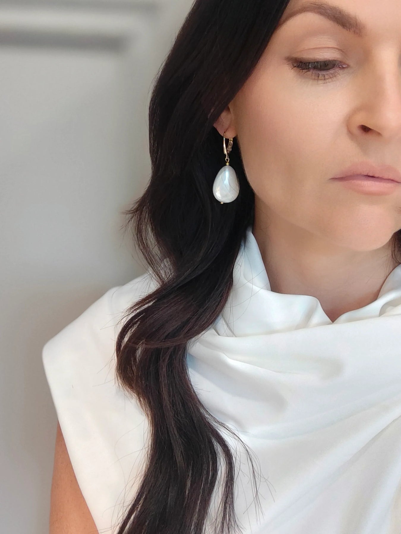 These elegant earrings feature a lustrous 20mm textured teardrop freshwater pearl, delicately suspended from an 18ct gold-plated hinged earring. Designed to catch the light with every movement, they bring effortless sophistication to both contemporary and classic bridal looks.