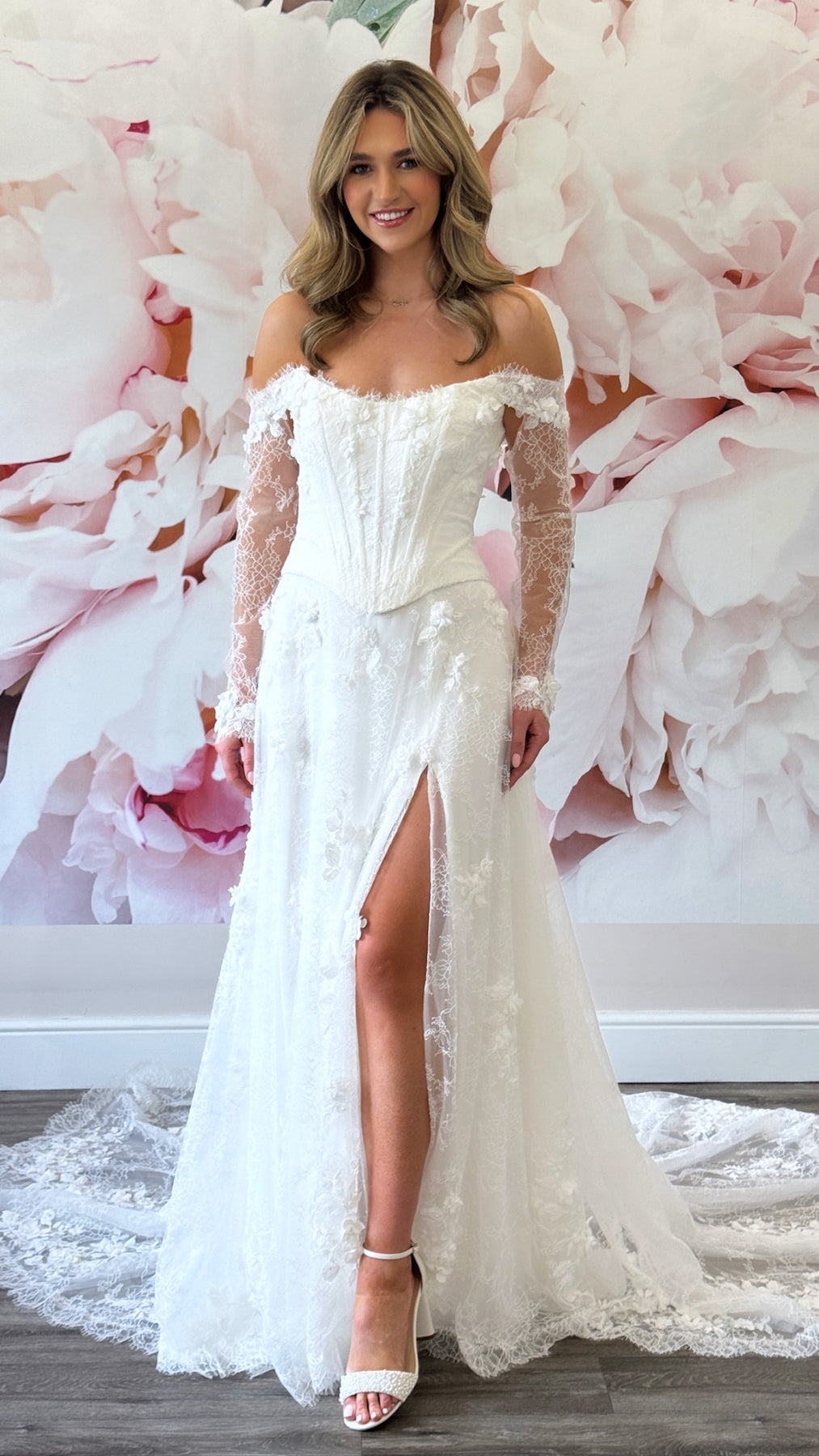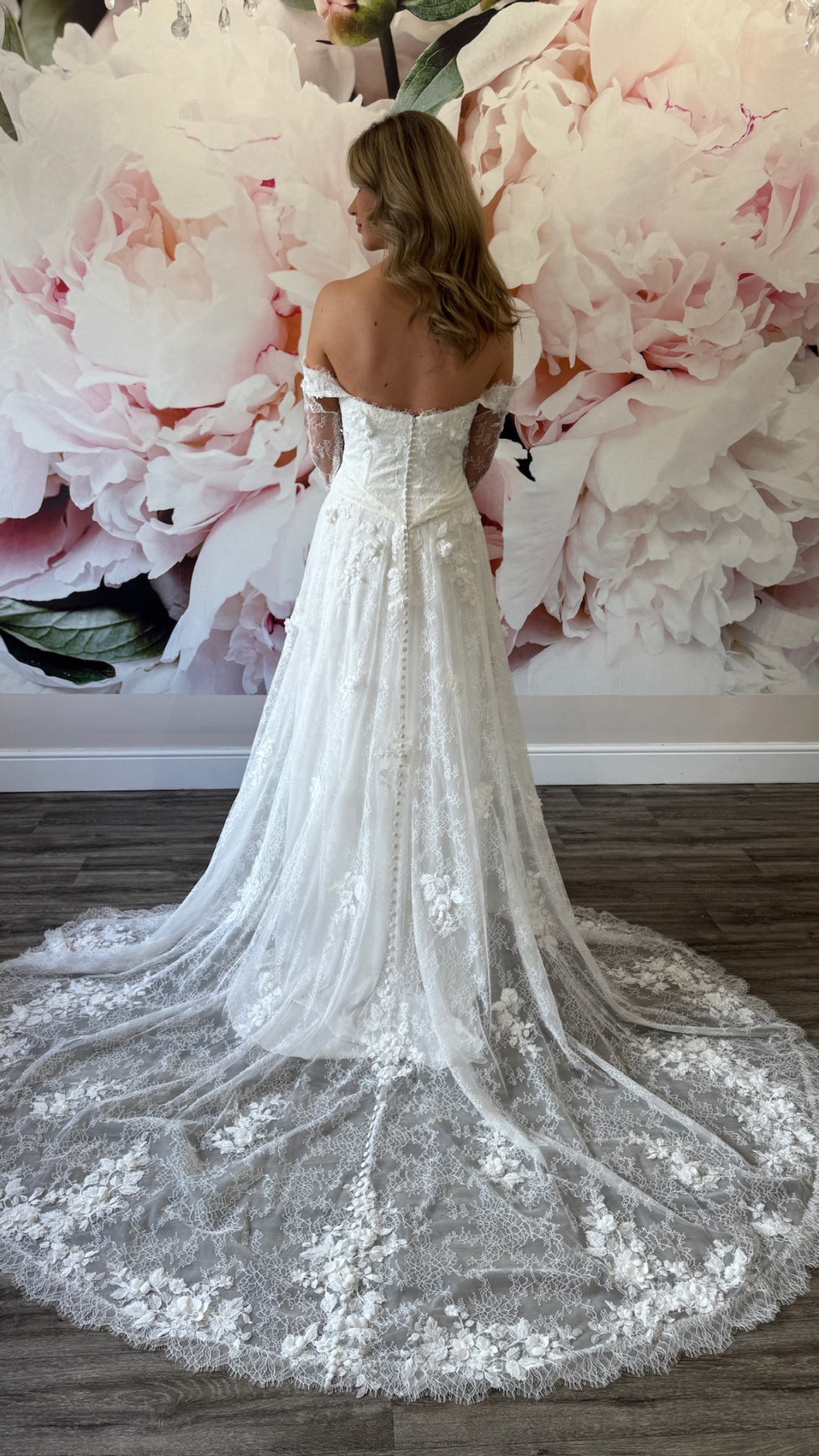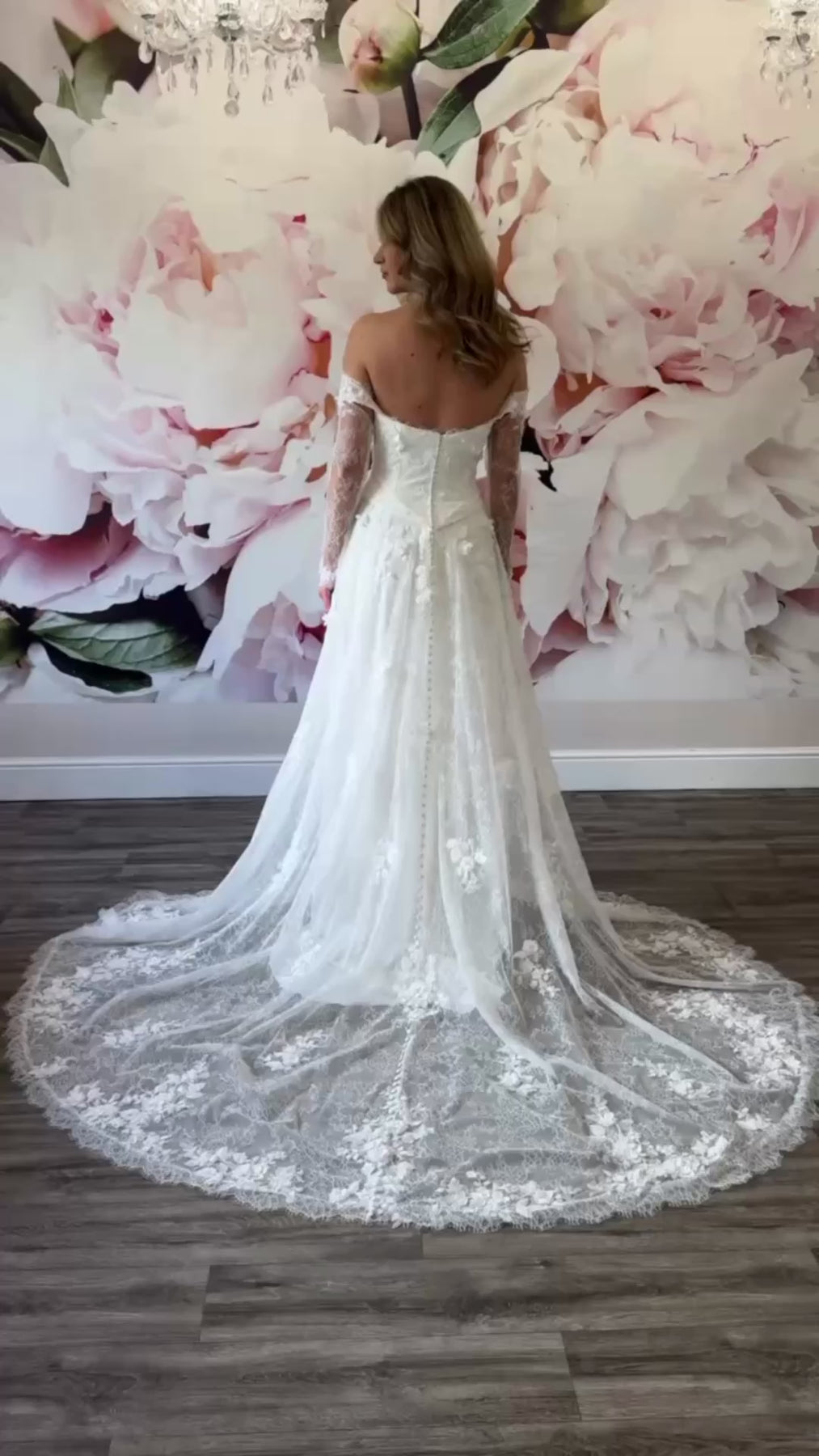 Radiating timeless romance with a modern edge, Cara is pure understated glamour. The clean strapless bodice and flowing A-line skirt create a beautifully balanced silhouette, while the detachable sheer sleeves add a touch of softness and versatility. A subtle high-leg slit brings just the right amount of contemporary drama, finished with classic covered buttons that trail down the train. Effortless, chic, and designed for the modern bride who loves refined simplicity.