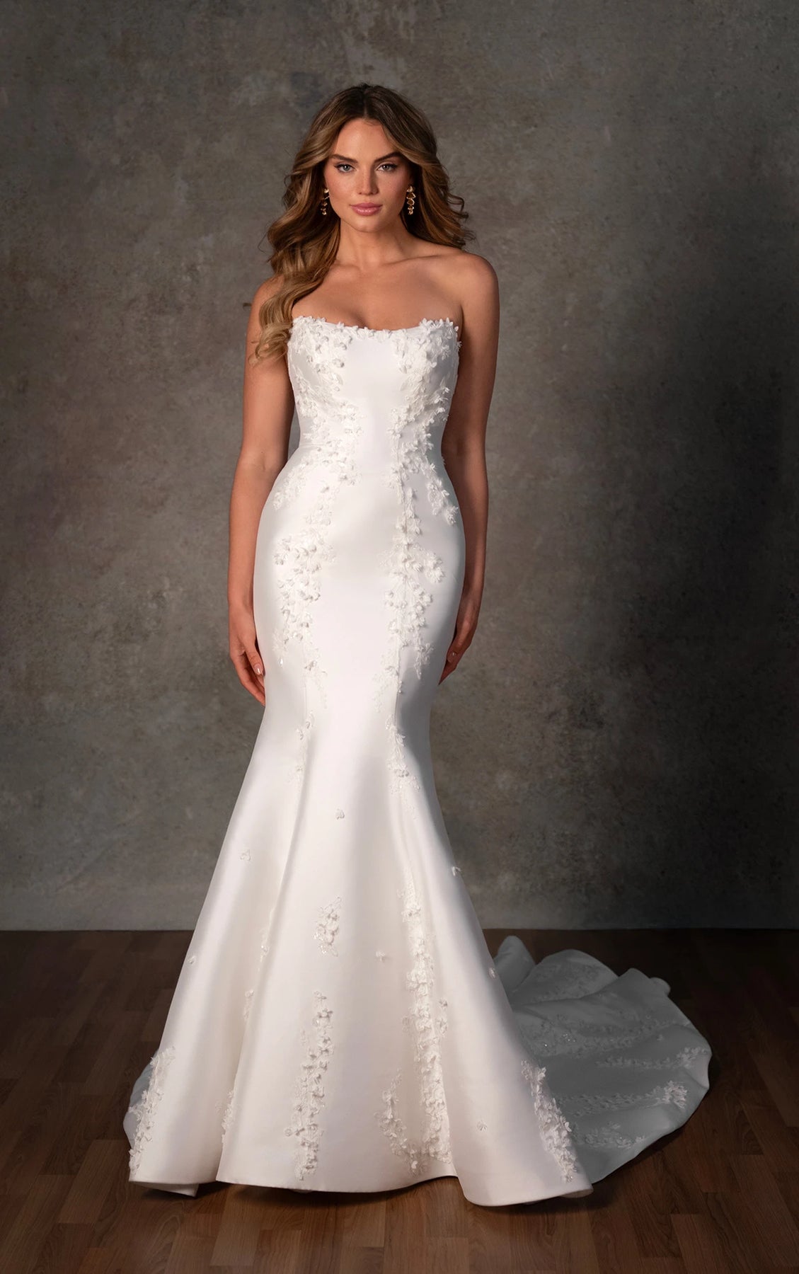 Modern simplicity meets timeless elegance in cecilla. Crafted in luxurious Mikado, this strapless fit-and-flare gown features a striking cat-eye neckline and beautifully structured bodice adorned with delicate 3D lace appliqués. The lace trails effortlessly into a sleek flared skirt, creating a refined silhouette that moves with ease and sophistication.