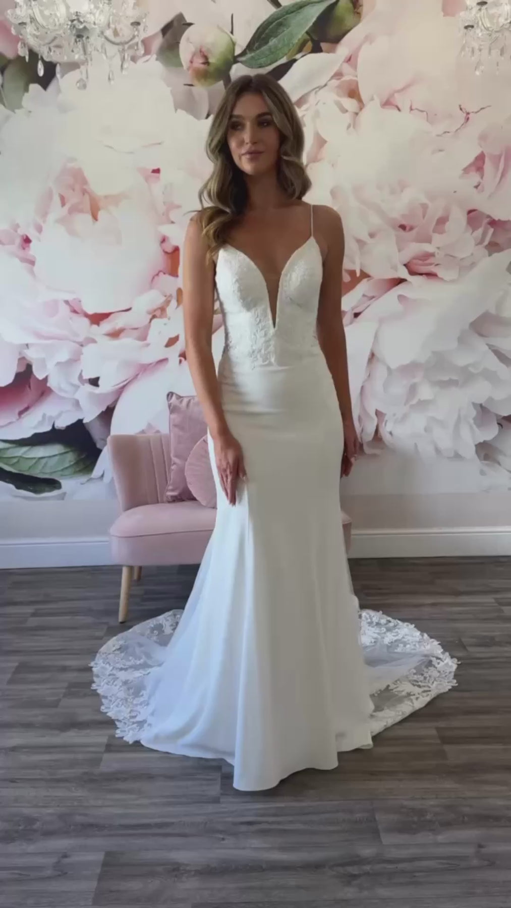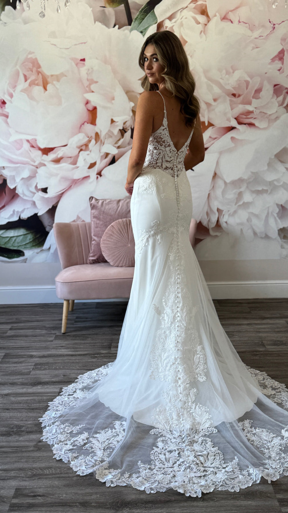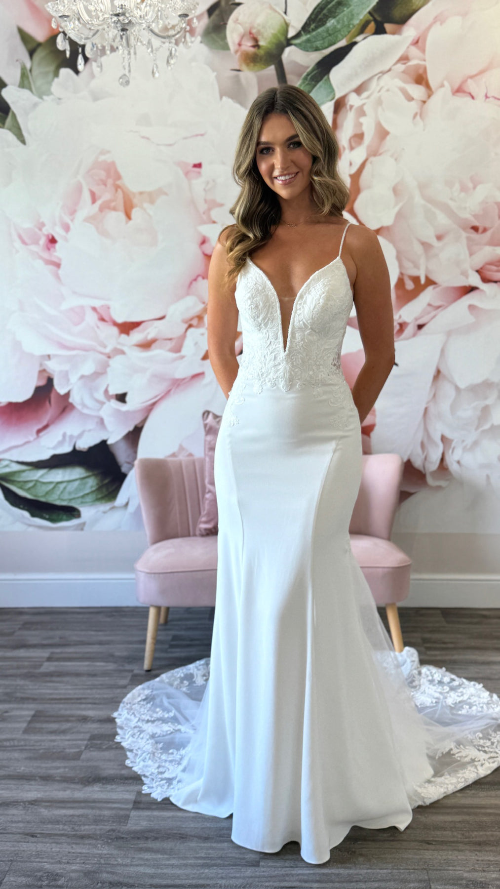 Our sample dresses in store range from size 10 to size 22 approx. The samples rarely fit anyone perfectly and our consultants are experts at clipping and pinning to help you you a great vision of the final fit.