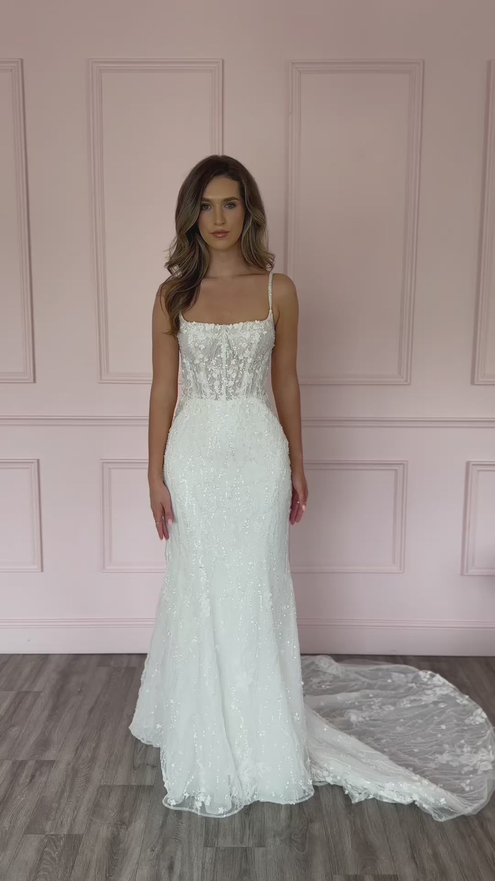Nova is a breathtaking vision of romantic, ethereal beauty, brought to life through the artistry of couture craftsmanship. Shimmering 3D floral embellishments and delicate strands of beading adorn her from the sparkling beaded spaghetti straps to the softly scooped neckline, creating a look that feels both magical and refined. The semi-sheer bodice, with its exposed boning and architectural seams, cinches the waist with subtle structure before giving way to a dreamy illusion tulle back scattered with glittering details. From there, the sleek column silhouette skims the curves and softly flares into an airy, sweeping train embellished with the same enchanting florals and shimmering touches. With every step, Nova radiates a sense of grace, romance, and timeless enchantment—perfect for the bride who wants to feel like she’s walking in a dream.