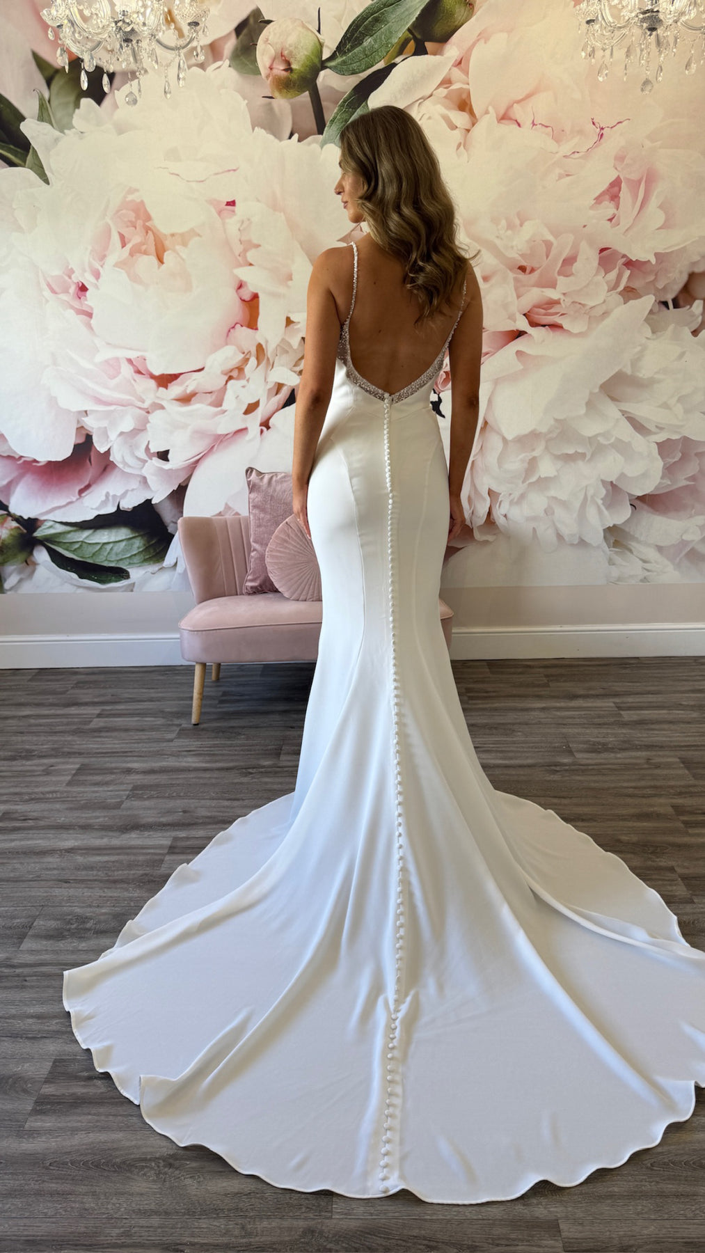 Alyssa is a stunning fitted wedding gown that radiates modern elegance with a touch of timeless romance. Delicate beaded spaghetti straps glisten as they frame the shoulders, leading into a graceful scoop neckline. Subtle pearl details peek through, adding a soft shimmer that catches the light with every movement. The fitted silhouette beautifully contours the figure, offering a chic and flattering shape for the modern bride. Effortlessly sophisticated yet undeniably romantic, Alyssa is the perfect gown for brides seeking a sleek, refined, and unforgettable look.