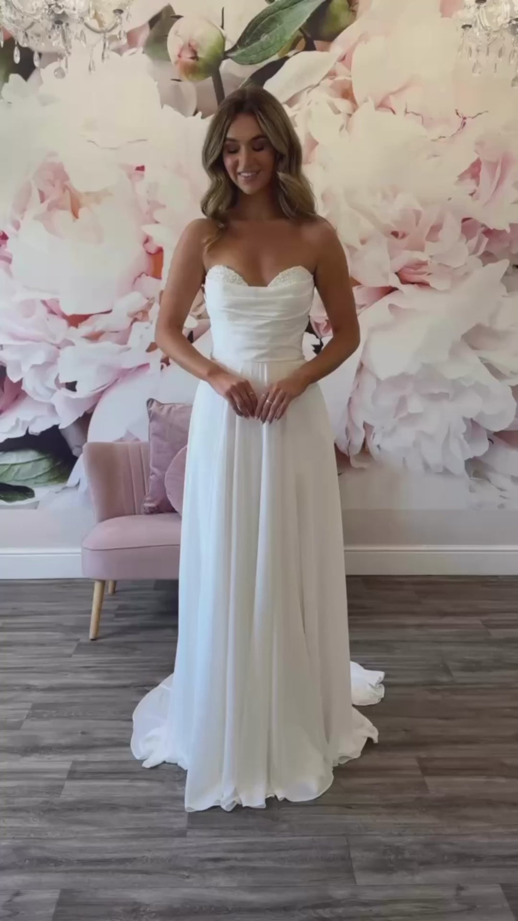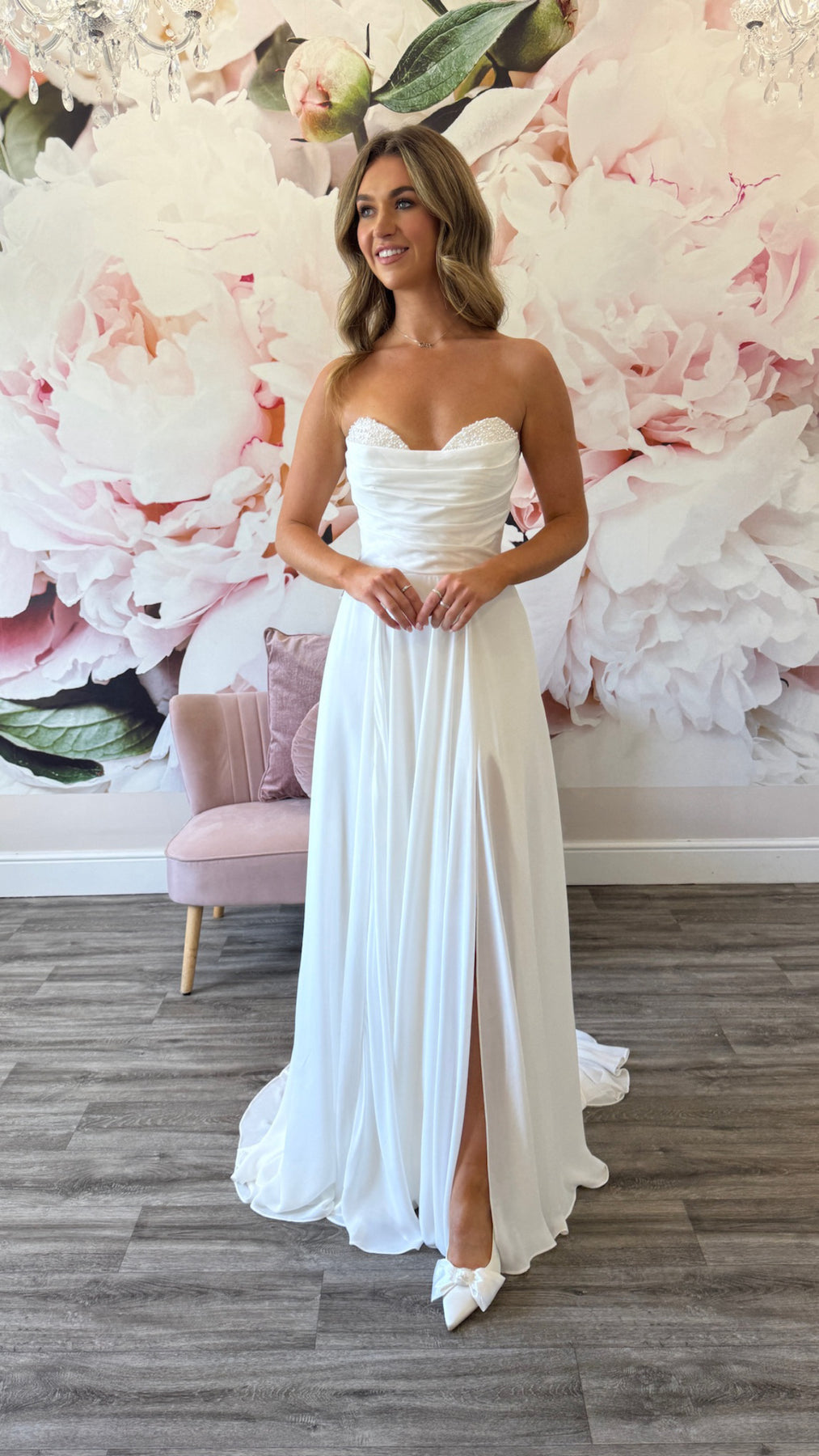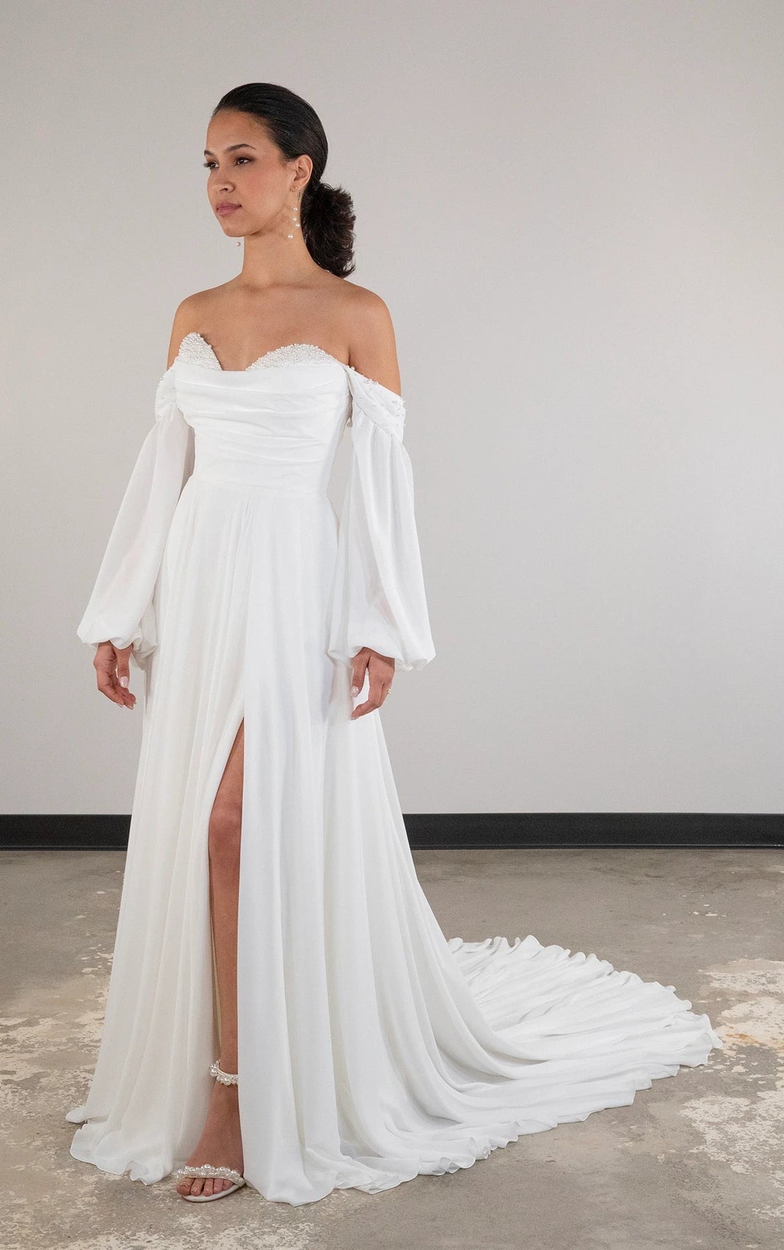 Sasha is a dreamy ode to the modern goddess, a flowing chiffon gown that exudes ethereal romance. Her strapless bodice is softly draped and crowned with a pearl-embellished sweetheart neckline, catching the light with a delicate shimmer. Detachable long sleeves, scattered with pearls at the top, drift off the shoulders into pillowy blouson sleeves that billow gracefully before gathering at the wrists—an enchanting detail that feels both regal and poetic. From the waist, layers of chiffon cascade into a soft A-line skirt, parting to reveal a high leg slit that adds movement and allure with every step. Light as air and impossibly romantic, Sasha is a gown that embodies grace, femininity, and timeless beauty. This gown is also available in plus sizes.