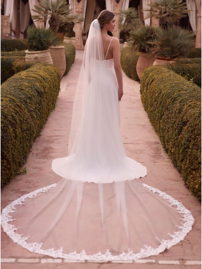 This bridal veil is crafted from pure soft tulle, featuring a refined one layered design and measures 350 cm in length. It features a delicate cut and lace edge.  All veils are carefully designed and manufactured in in EU.