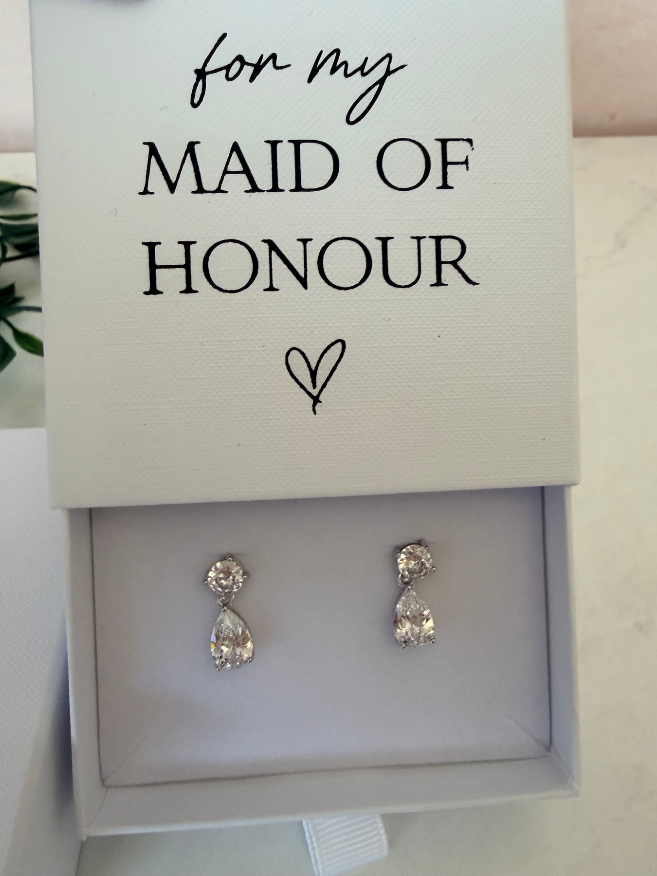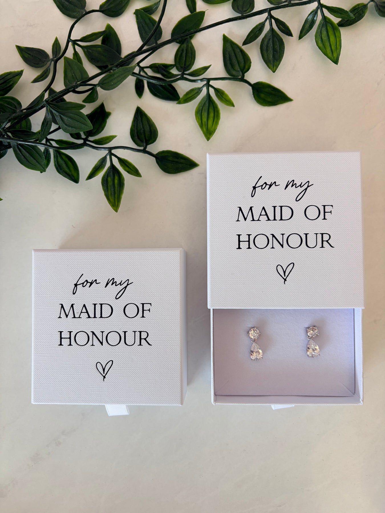 Each pair arrives beautifully presented in our signature black and white maid of honour packaging, making them a thoughtful gift your bridesmaids will cherish long after the wedding.