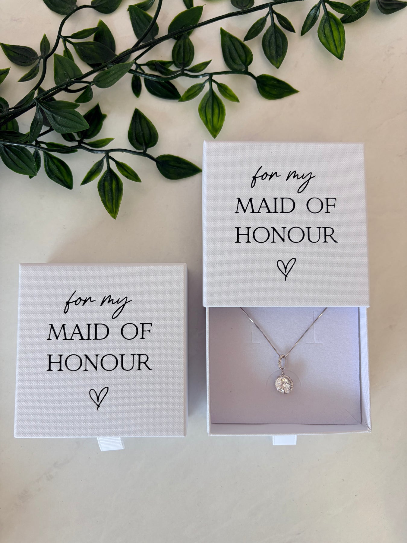 Beautifully presented in our “For my Maid of Honour” black and white gift box, it’s a meaningful keepsake your bridesmaids can wear on the day and treasure long after the celebration.